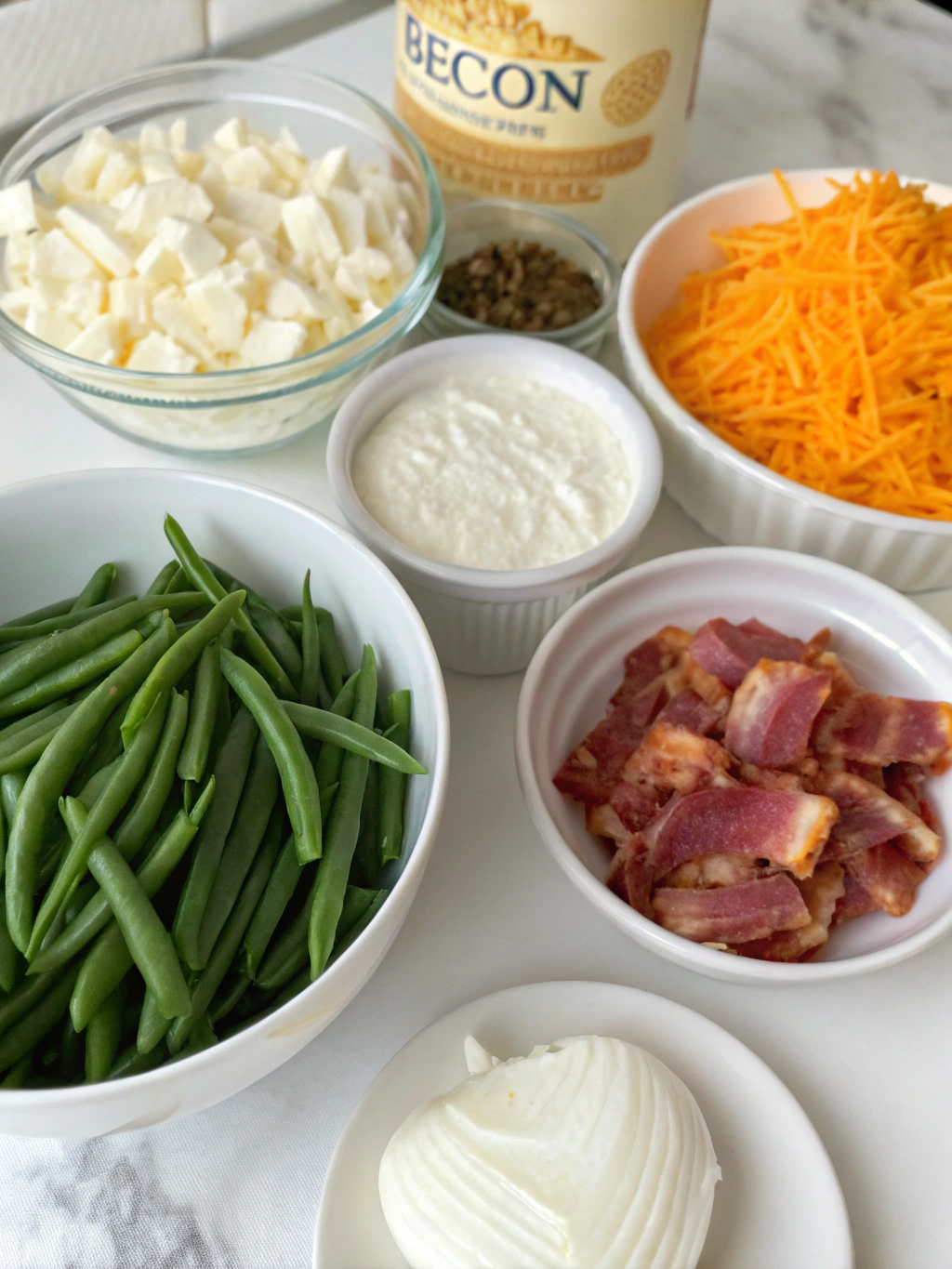 1/4 cup milk – The milk helps thin out the soup mixture just enough to coat every green bean perfectly. It also helps the cheese melt smoothly without clumping.