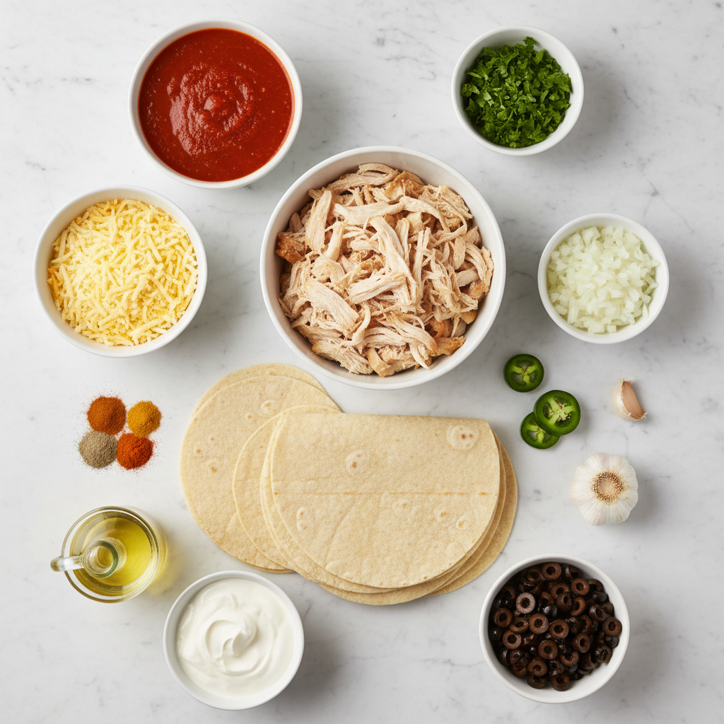 2. Cook the filling: Sauté onion in oil, then garlic. Add chicken, cumin, chili powder, salt, pepper, and 3–4 tbsp of the sauce. Cook 5 minutes.