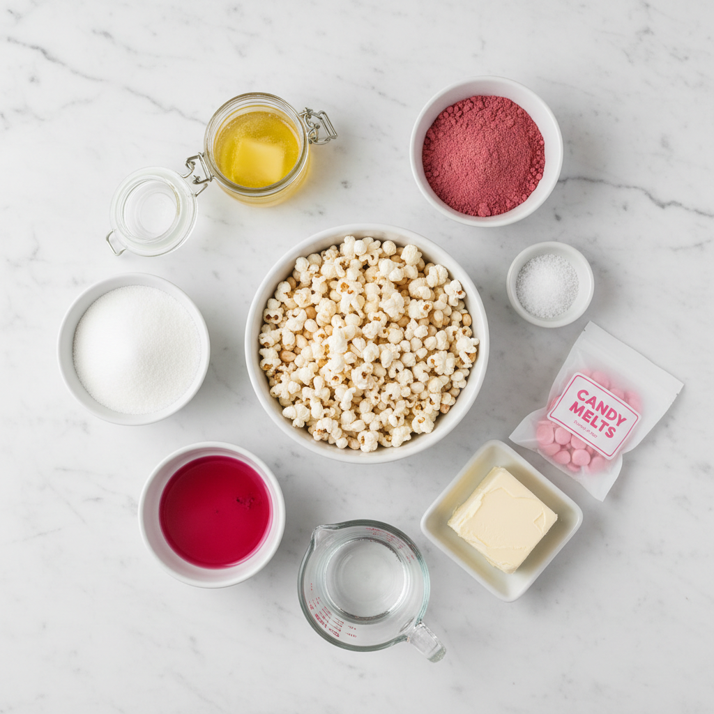 1/2 cup pink candy melts : These little discs are the stars of the show. Pink candy melts create that beautiful rosy coating while adding sweetness that perfectly balances the salty popcorn. They melt smoothly and set quickly, creating a glossy finish that looks professional but requires zero special skills.